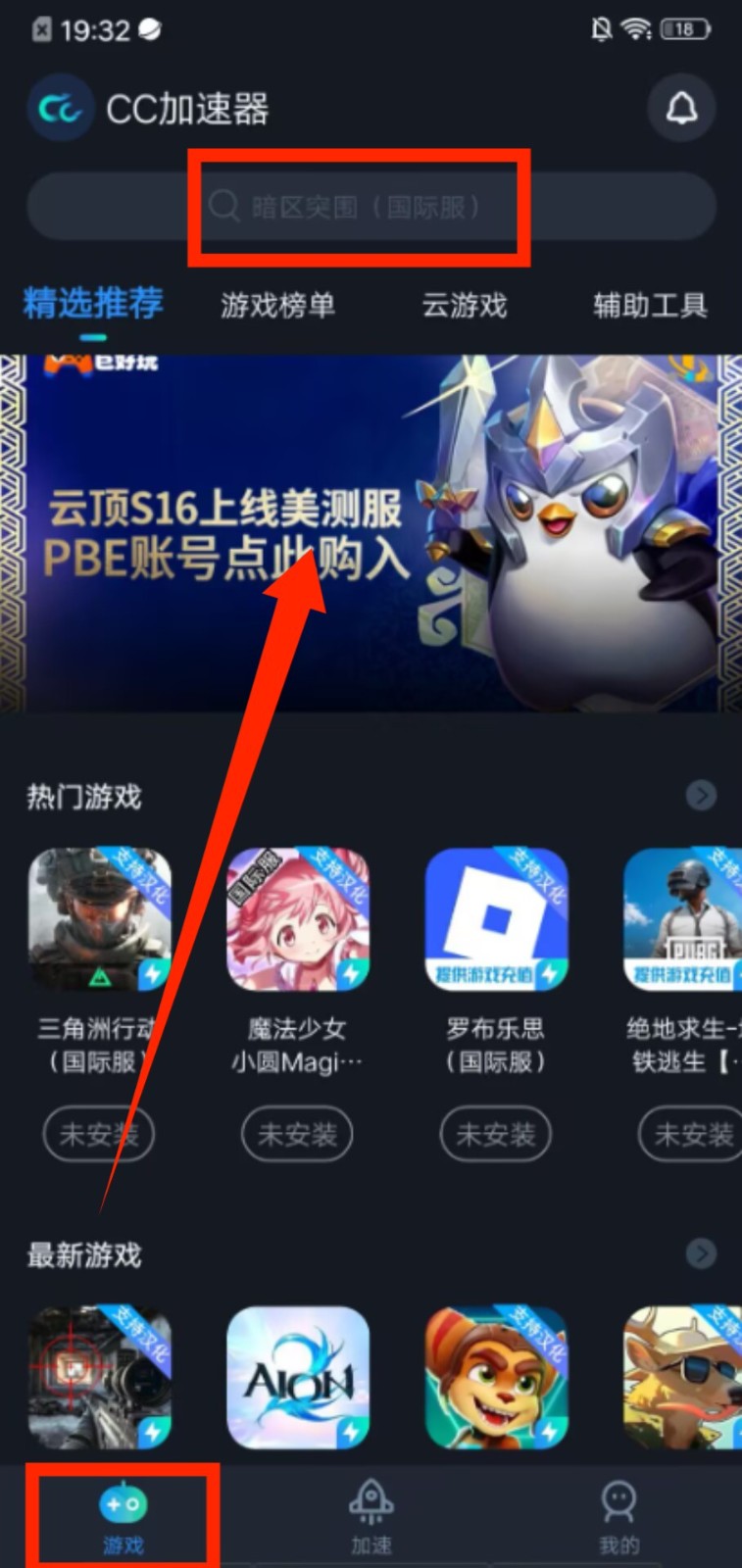 1、在 CC 加速器的 “游戏” 页面,点击上方搜索框,输入想要加速的游戏名称。