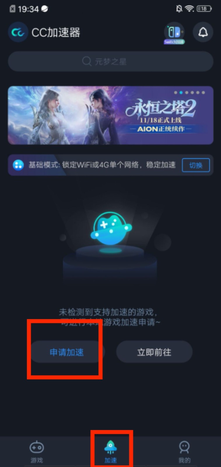 3、切换到 “加速” 页面,若未检测到支持加速的游戏,点击 “申请加速” 按钮。