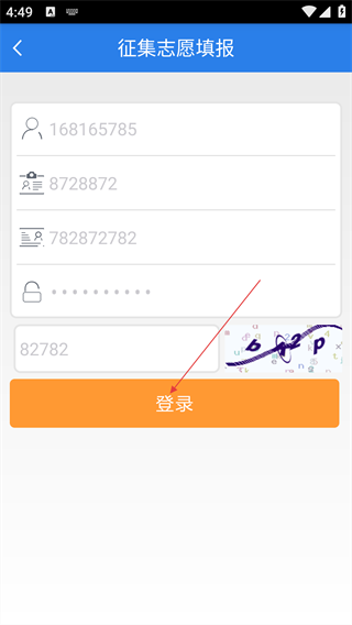 3、在“征集志愿填报”页,依次填写14位考生号、9位准考证号、18位身份证号、对应密码,并输入验证码。
