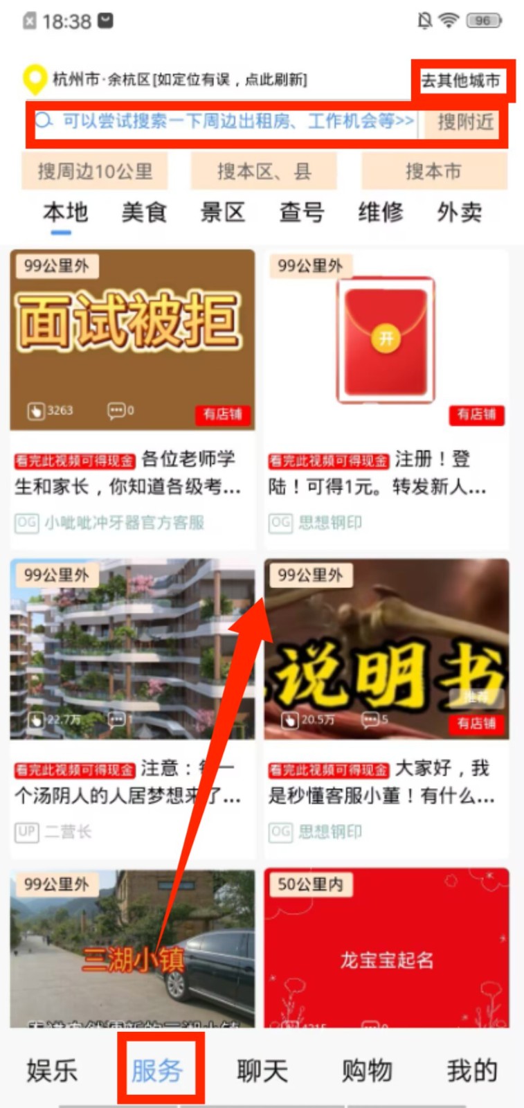 2、切换到服务页面,通过搜索栏查找周边租房、工作机会等信息,还能切换城市调整定位范围。