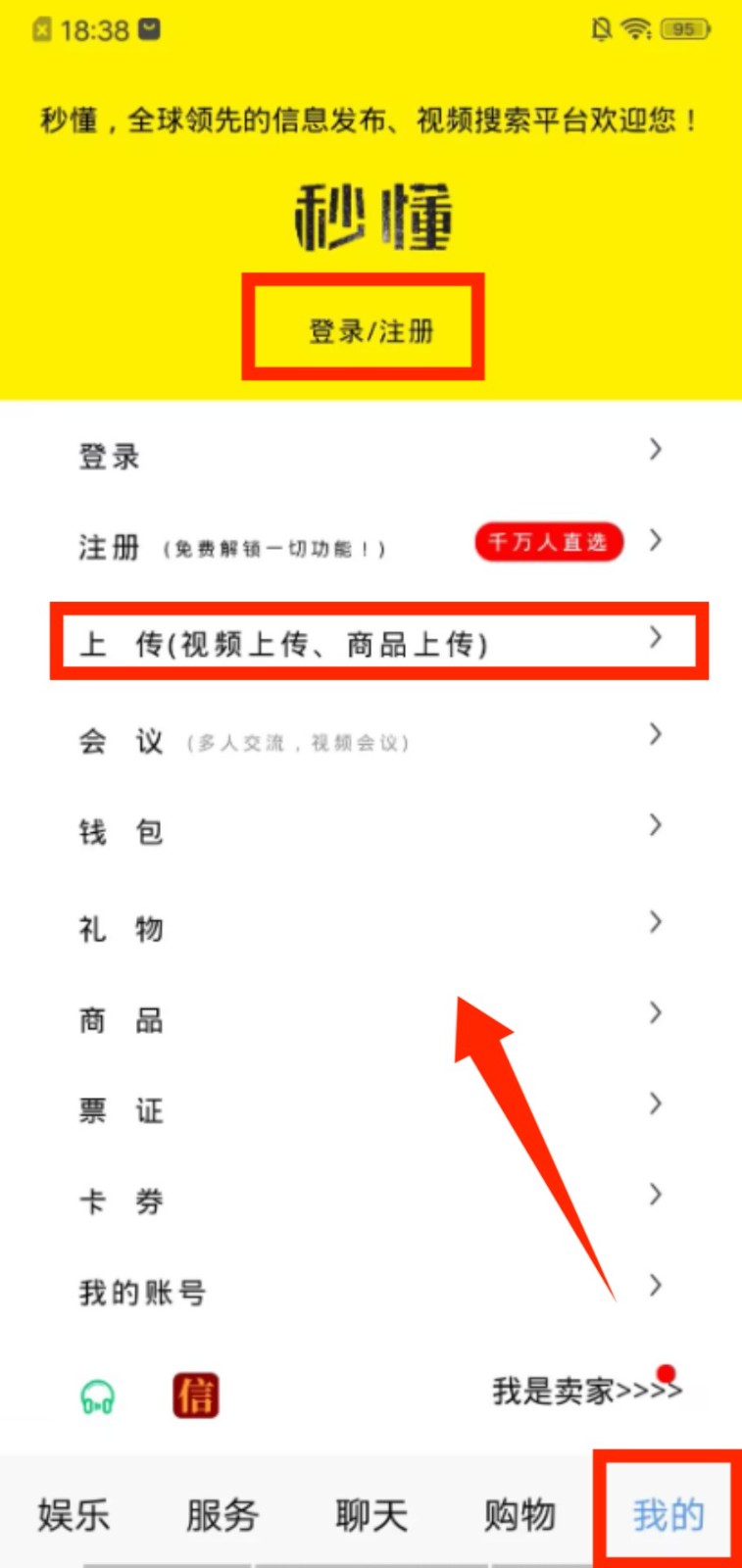 4、进入 “我的” 页面,选择 “上传” 选项,能进行视频、商品的上传操作,管理个人发布的内容。