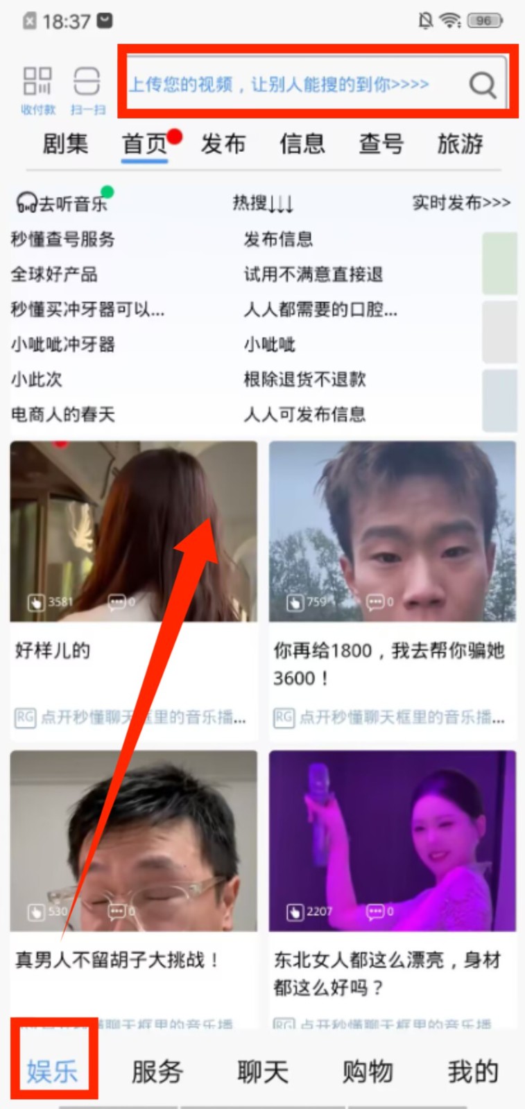 1、进入娱乐页面,点击顶部搜索框可上传视频,也能浏览推荐的各类内容,参与互动查看相关动态。