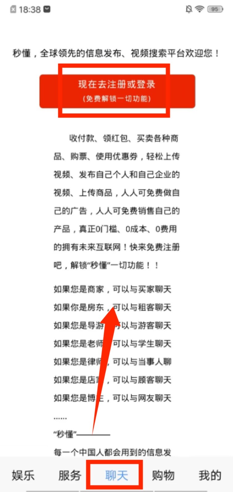 3、打开聊天页面,点击 “现在去注册或登录” 完成账号操作后,可解锁互动、交易等功能权限。