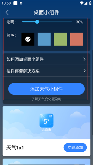 4、完成样式设置后,点击【添加天气小组件】按钮,即可将天气小组件添加至手机桌面,也可通过“如何添加桌面小组件”选项了解添加方法。