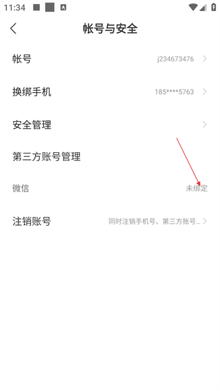 4、在帐号与安全界面,点击【微信】,按照提示完成微信账号的绑定操作。