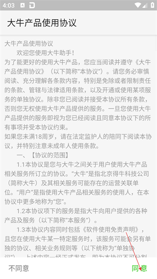 1、首次打开大牛助手,阅读《大牛产品使用协议》后,点击【同意】按钮,进入应用。