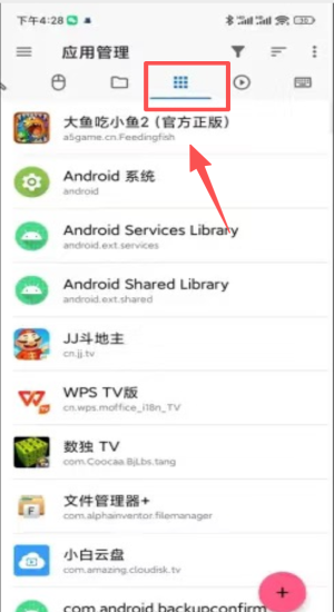 4、上方选项栏点至应用,右下角+号安装应用,选择手机中提前下载好的apk;