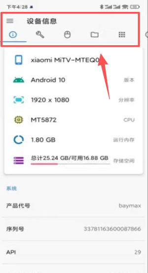 1、打开APP自动识别小米电视,查看分辨率内存与剩余存储信息。