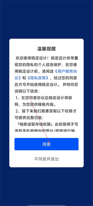1、使用【稿定设计】前,需阅读《用户服务协议》和《隐私政策》,点击【同意】方可使用。
