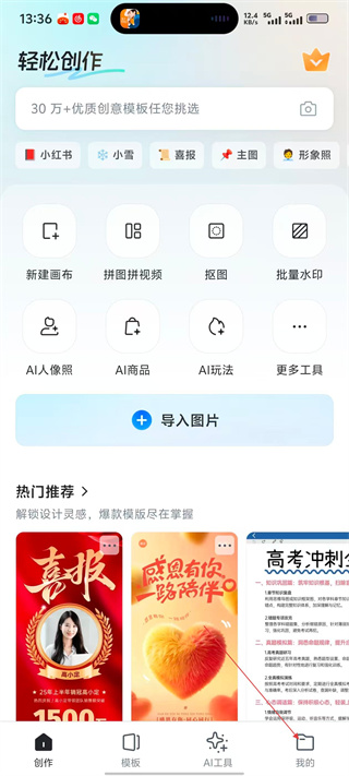 2、在【稿定设计】创作界面,有30万+优质模板可选,具备新建画布、抠图等功能,可点击【我的】进入个人界面。