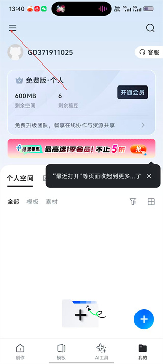3、进入【稿定设计】个人界面,可查看剩余空间、剩余粮豆等信息,还可开通会员,界面有个人空间板块可管理模板素材。