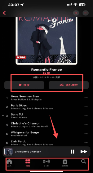 4、进入专辑详情挑曲目,点播放即可全曲畅听与随机浏览。