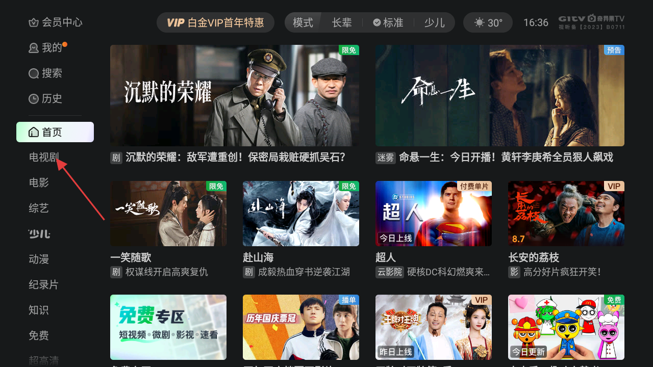 1、进入银河奇异果界面,左侧有【会员中心】【我的】等选项,还有【电视剧】分类,点击【电视剧】可进入电视剧页面。