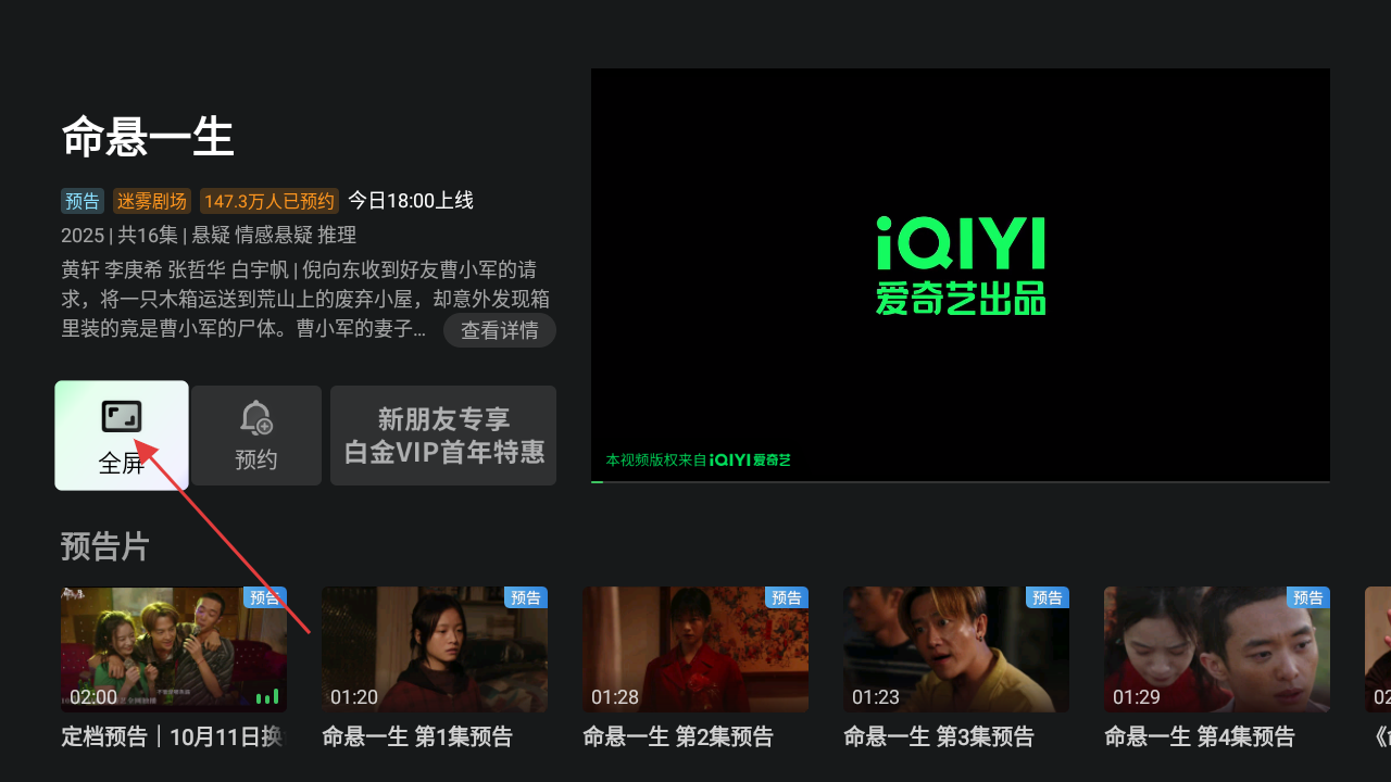 3、进入《命悬一生》详情页面,能看到剧集简介等信息,点击【全屏】可进入全屏播放模式。