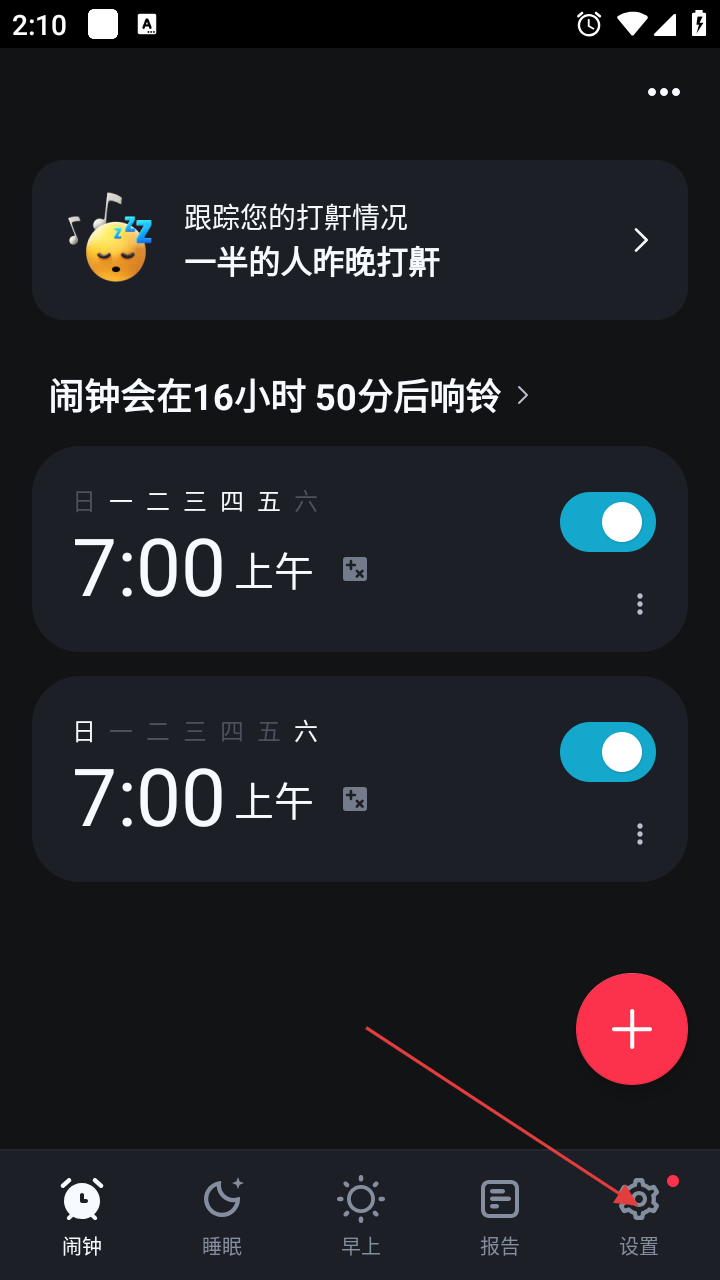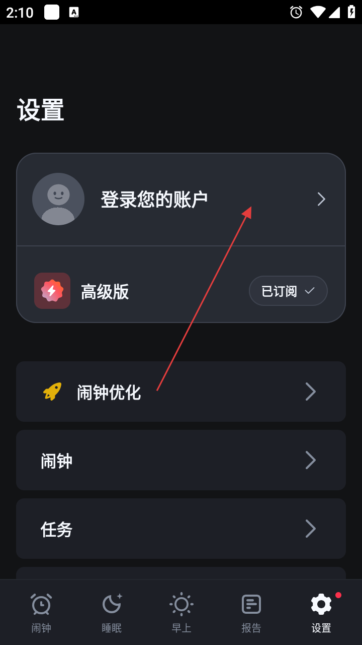 2、在闹钟主界面,点击右下角【设置】选项,进入设置界面,可进行账户等相关设置。