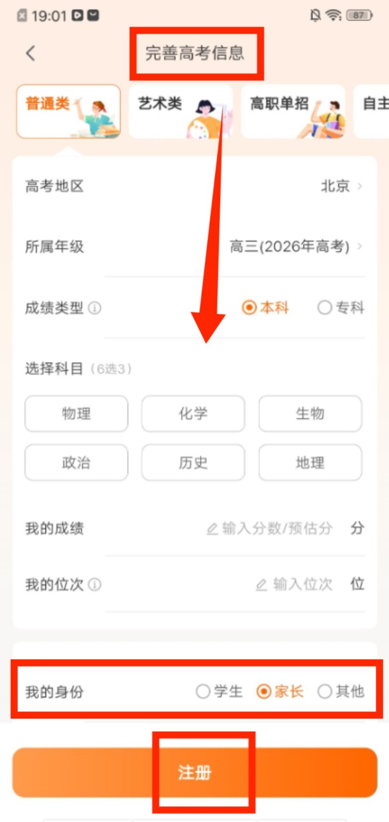 1、进入完善高考信息页面,选择考试类型、地区、科目等信息,选定身份后点击注册完成信息提交。
