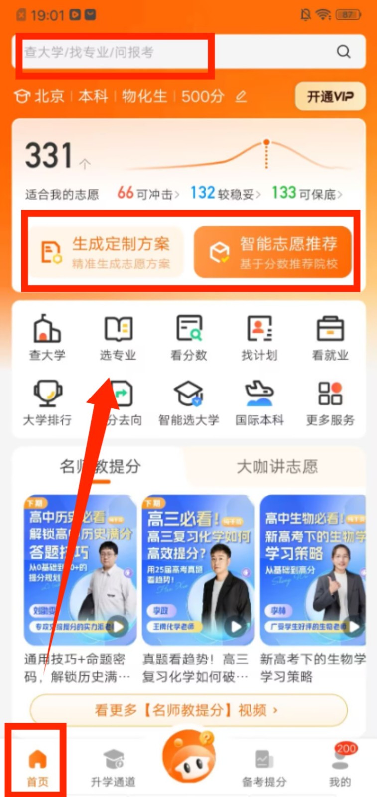 2、切换到首页,通过顶部搜索框查找院校或专业,也能点击 “生成定制方案” 获取志愿填报建议。