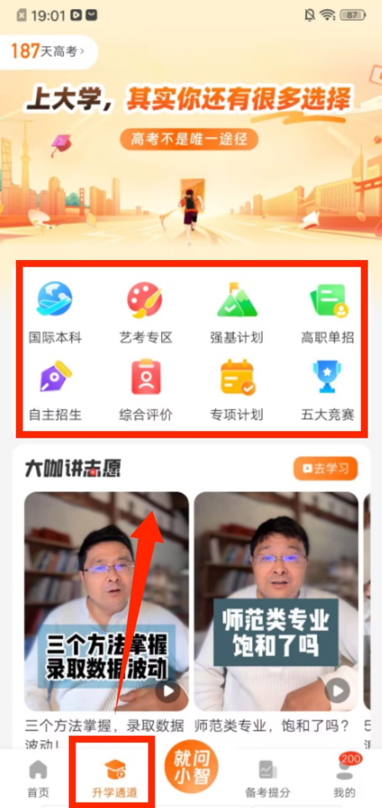 3、打开升学通道页面,可查看国际本科、艺考专区等升学途径,浏览相关的报考指导内容。