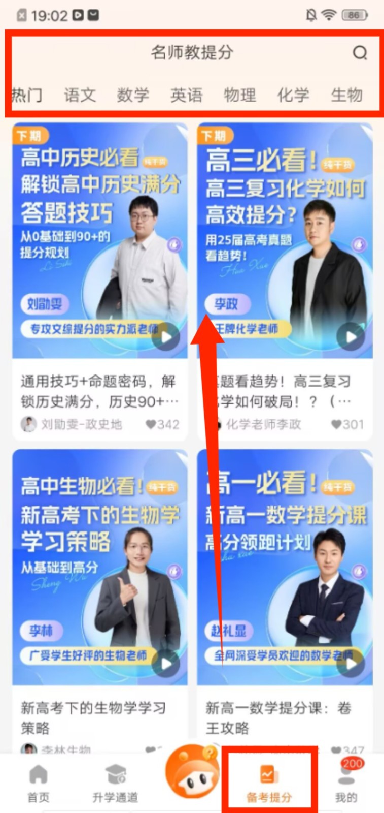 4、进入备考提分页面,通过科目分类筛选对应学科的提分课程,选择课程观看学习提升成绩。