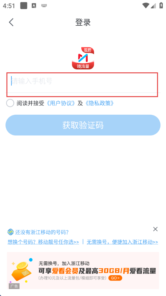 3、登录页面,先在输入框输入手机号,勾选接受【用户协议】及【隐私政策】,再点【获取验证码】。