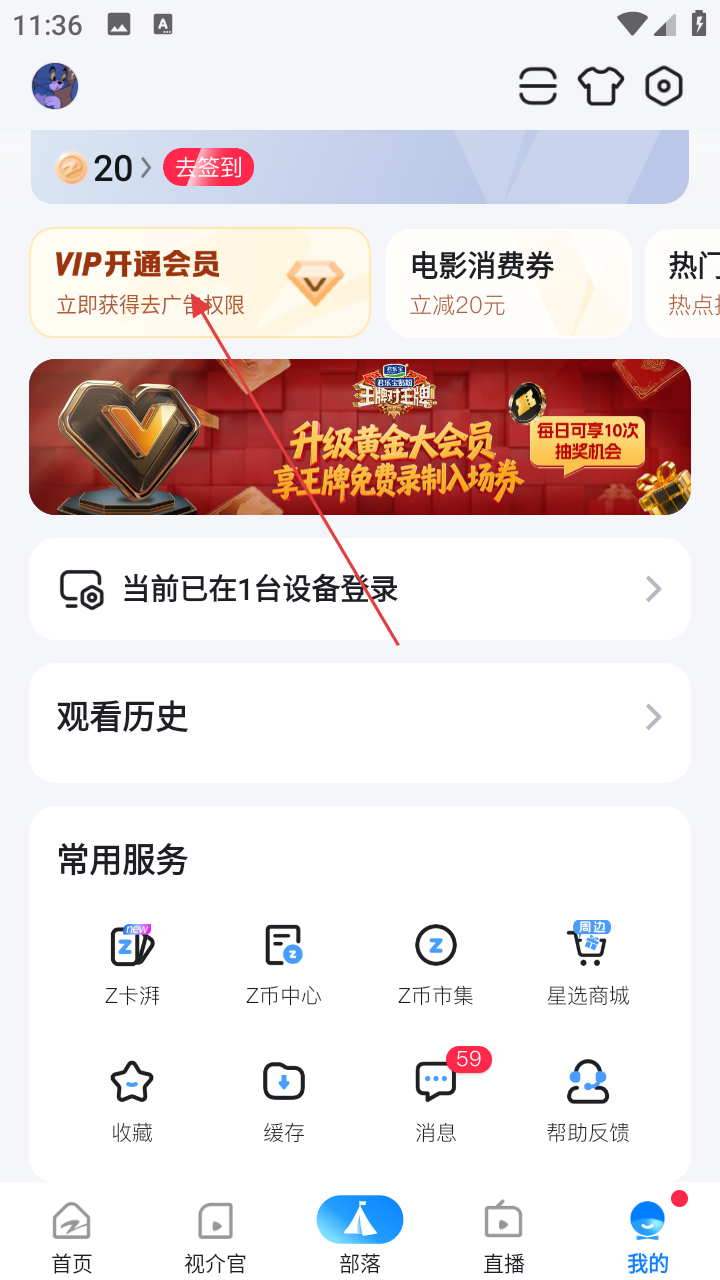 2、进入个人中心页面后,点击【VIP开通会员】选项,进入会员开通界面。
