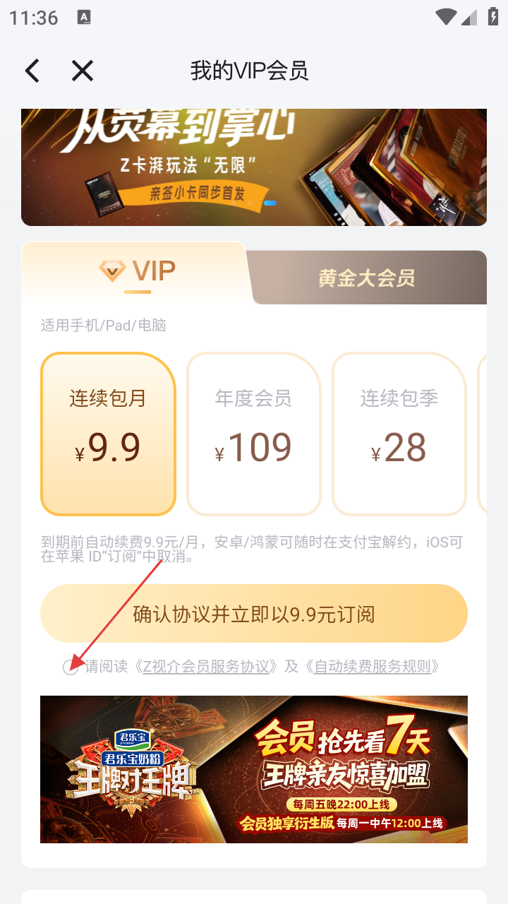 3、在会员开通界面,选择会员类型,勾选协议阅读选项。