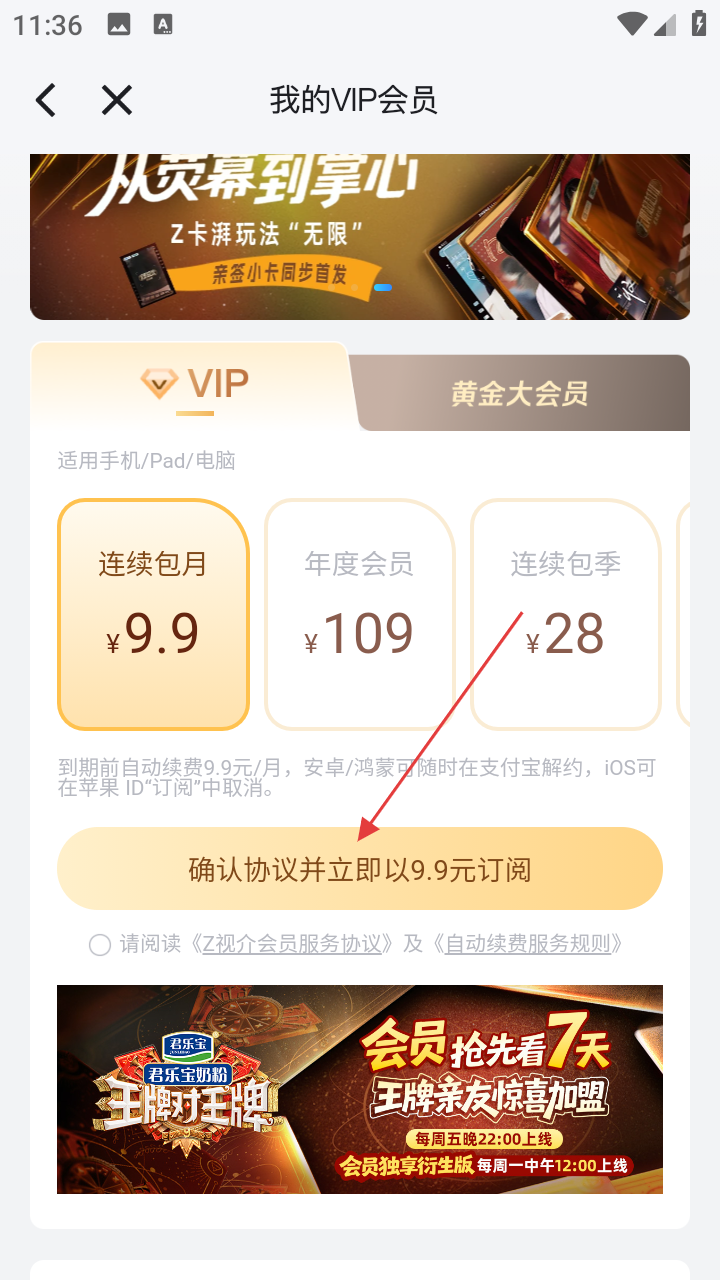 4、勾选协议后,点击【确认协议并立即以9.9元订阅】按钮,完成会员订阅。