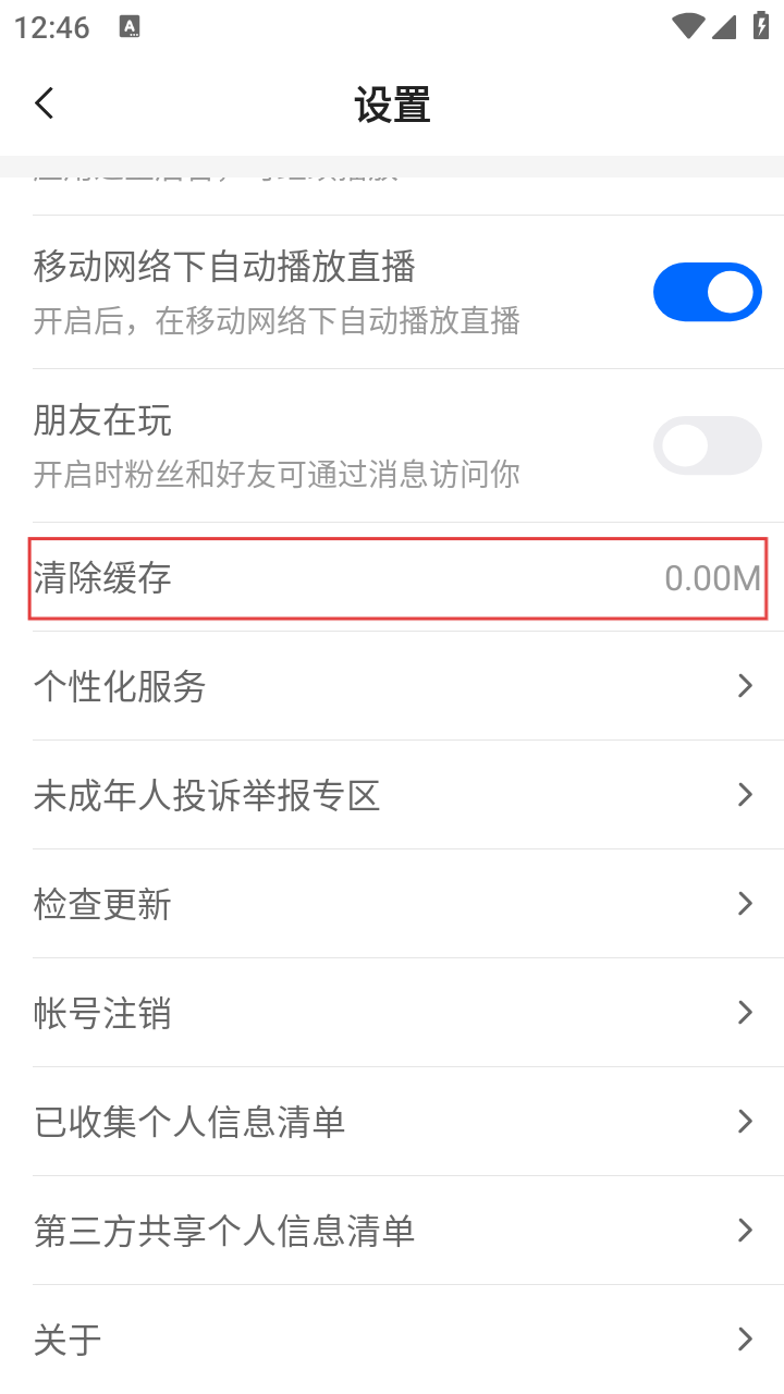 3、在设置界面,点击【清除缓存】可清理平台缓存数据,还能对移动网络下自动播放直播、朋友在玩等功能进行管理。