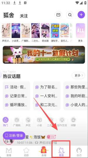 3、在“狐舍”页面点击“声优讨论”标签,参与热门话题讨论。