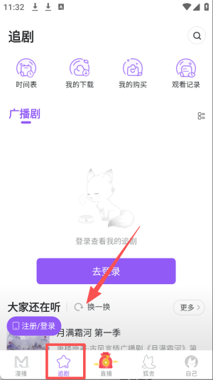 1、点击底部“漫播”标签,进入音频直播和广播剧页面。