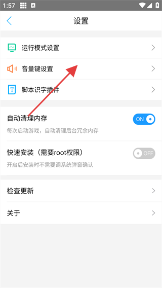 3、在【设置】页面中,点击【音量键设置】选项,可进入对应界面,配置音量键关联的脚本操作功能。