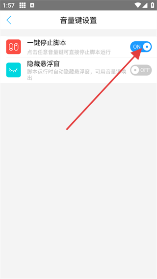 4、在【音量键设置】界面,可开启【一键停止脚本】功能,点击任意音量键即可直接停止脚本运行,提升操作效率。