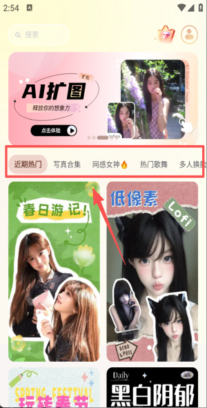 1、打开万颜相机,在顶部搜索框输入“春日游记”,点击“AI扩图”先体验功能。