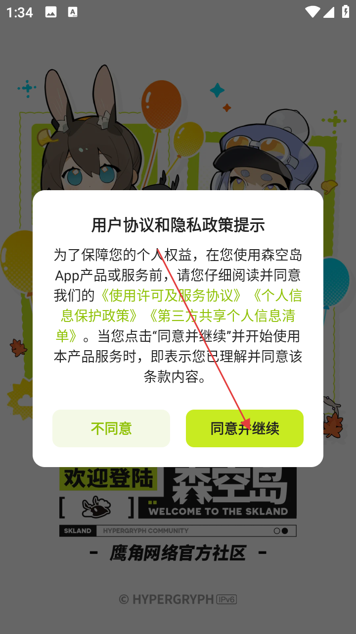 1、打开森空岛App,在用户协议和隐私政策提示弹窗中,点击【同意并继续】。