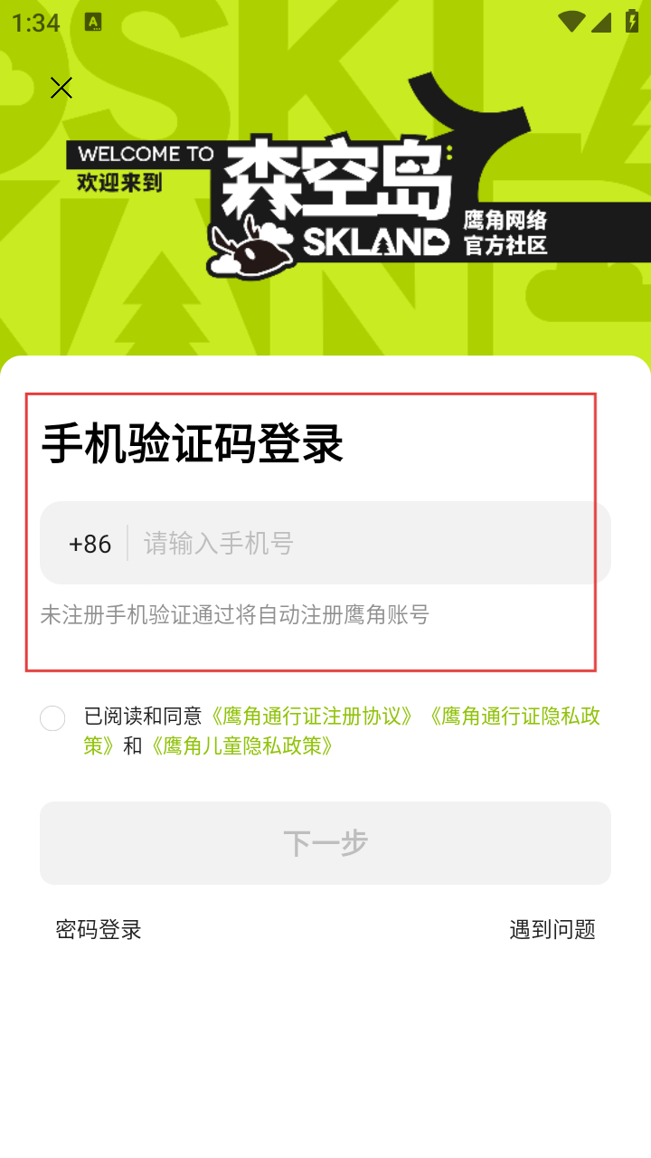2、进入登录选择页面后,点击【手机号登录】按钮,进入手机验证码登录界面。