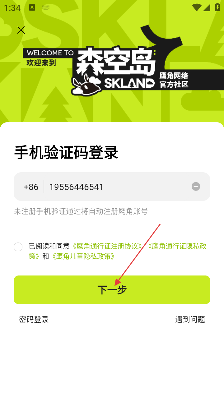 4、输入手机号后,勾选已阅读和同意相关协议,点击【下一步】按钮。