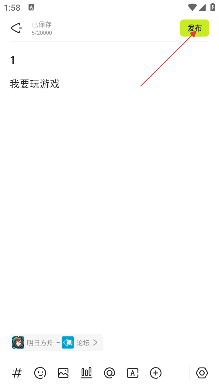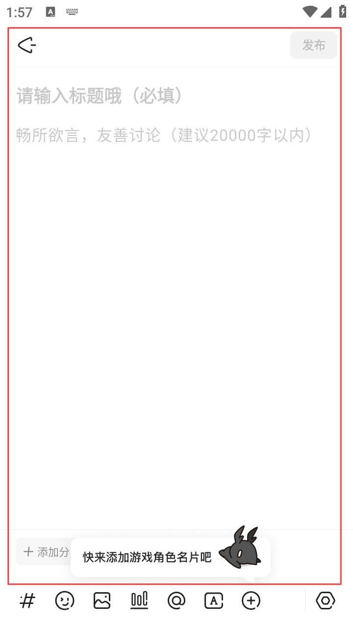 3、在图文编辑页面,输入标题和内容,可添加游戏角色名片等元素。