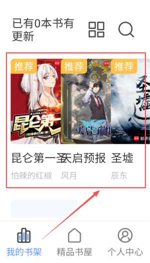 1、用户打开奇墨小说app,进入首页,在我的书架页面,用户可查看推荐书籍和有更新的书籍,点击个人中心;