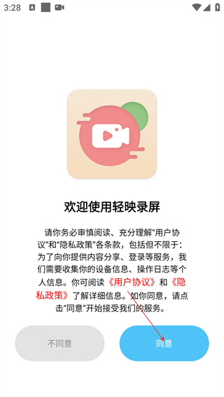 1、使用【轻映录屏】前,需阅读【用户协议】和【隐私政策】,点击【同意】按钮完成初始授权,即可进入软件。