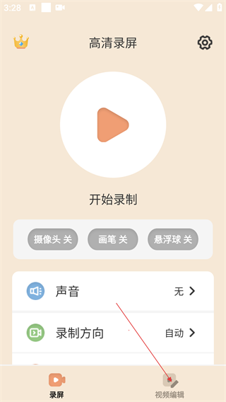 2、进入【高清录屏】界面,可设置【声音】-【录制方向】,点击视频编辑,进入视频编辑界面。