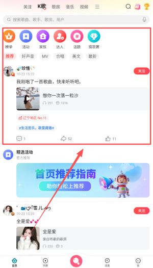 用户在登录之后会进入首页,在首页可以查看别人唱歌的内容,进入歌房一起唱歌,观看小视频。