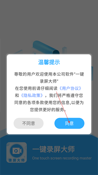 1、使用【一键录屏大师】前,需阅读《用户协议》与《隐私政策》,点击【同意】按钮完成授权,即可进入软件使用。