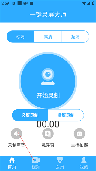 2、进入软件后,可选择【标清】【高清】【超清】画质及【竖屏录制】【横屏录制】模式,点击底部【视频】进入对应界面。