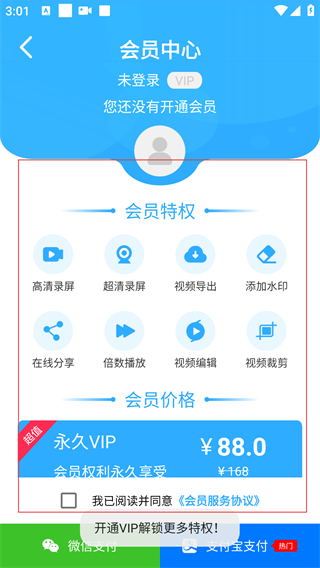 4、进入【会员中心】后,可查看【高清录屏】【视频编辑】等会员特权,勾选协议并选择支付方式,开通【永久VIP】解锁全部功能。