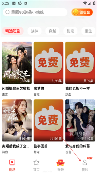1、打开短剧软件,剧场页面有【精选短剧】【战神】等分类,还有多部短剧可供选择,可根据喜好浏览观看,点击底部【我的】。