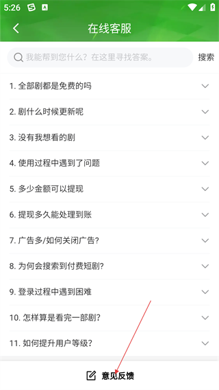 3、在【在线客服】页面,可查看常见问题解答,若需反馈意见,点击【意见反馈】选项进入反馈界面。
