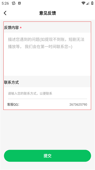 4、在【意见反馈】页面,填写反馈内容和联系方式后,点击【提交】按钮即可提交反馈,也可通过客服QQ进一步沟通。