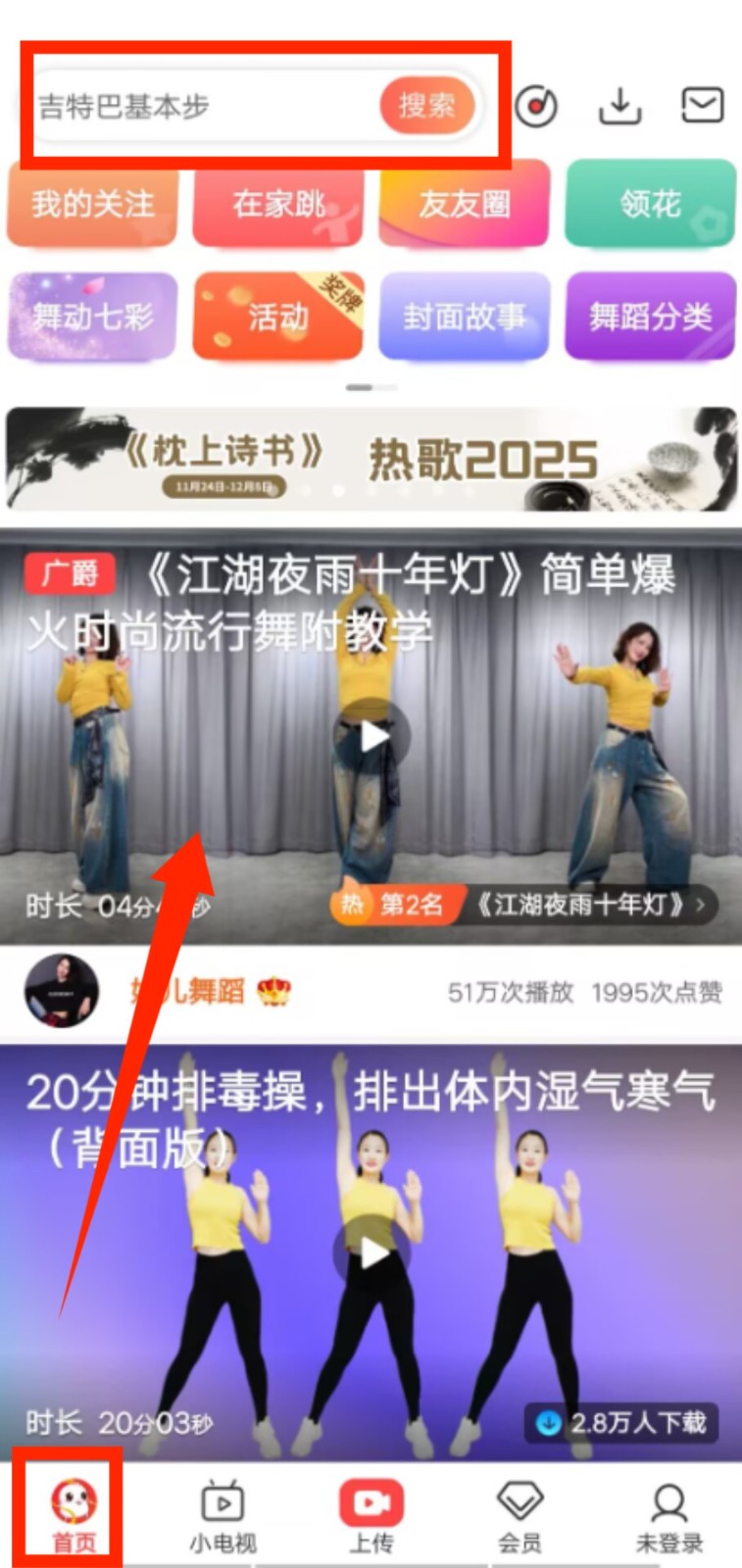 1、进入首页,点击顶部搜索框输入内容查找舞蹈教学视频,也能通过分类标签选择感兴趣的舞蹈内容。