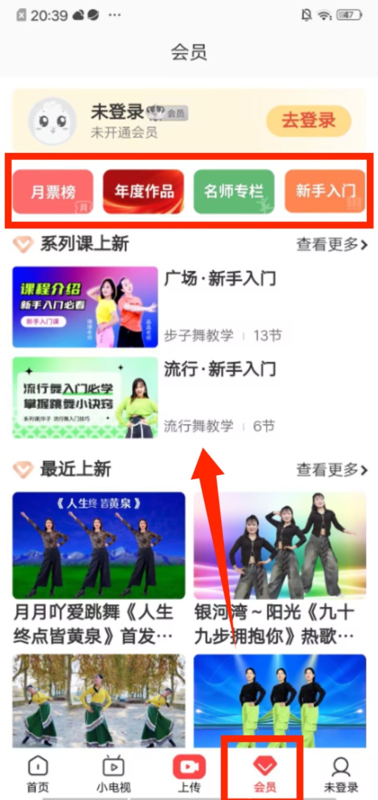 3、打开会员页面,在 “月票榜”“名师专栏” 等板块选择课程,可查看新手入门类的舞蹈教学内容。