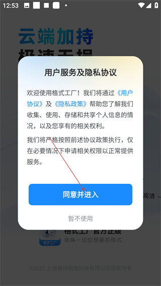 1、首次打开【格式工厂】需阅读【用户服务及隐私协议】,点击【同意并进入】按钮,即可解锁应用的全部功能模块。